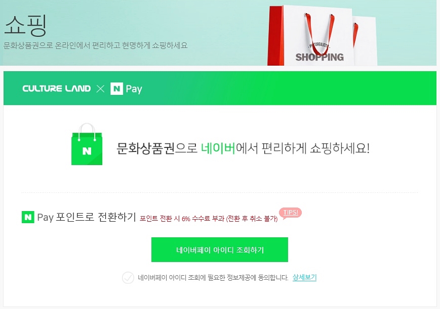 네이버쇼핑에서 사용하기 위해 네이버페이로 전환하려고 봤더니 포인트 전환 시 6% 수수료가 부과된다고 하네요. 그냥 전환하지 않고 쇼핑할 때 바로 컬쳐랜드 결제를 할 수 있는 곳에서 쓰는 게 나을 것 같습니다.