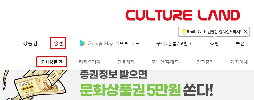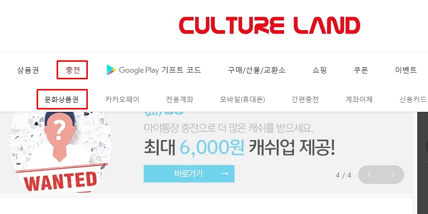 먼저 충전해 보기 전에 상단 메뉴의 충전 -> 문화상품권 메뉴로 가 봅니다.