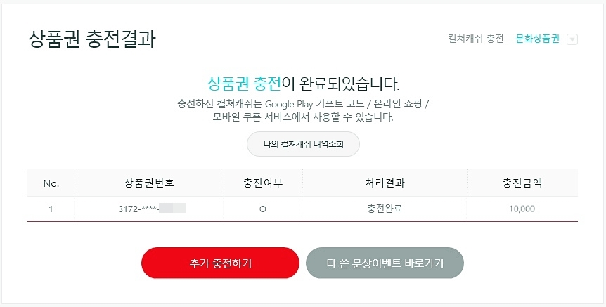 충전한 1만원은 구글플레이 기프트코드, 온라인 쇼핑, 모바일 쿠폰 서비스 등에서 사용할 수 있습니다.