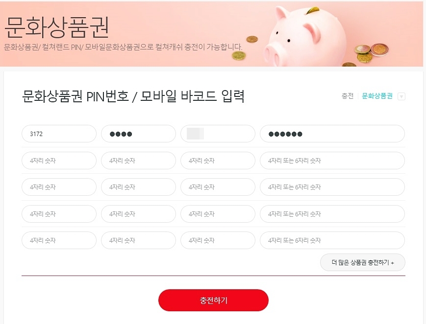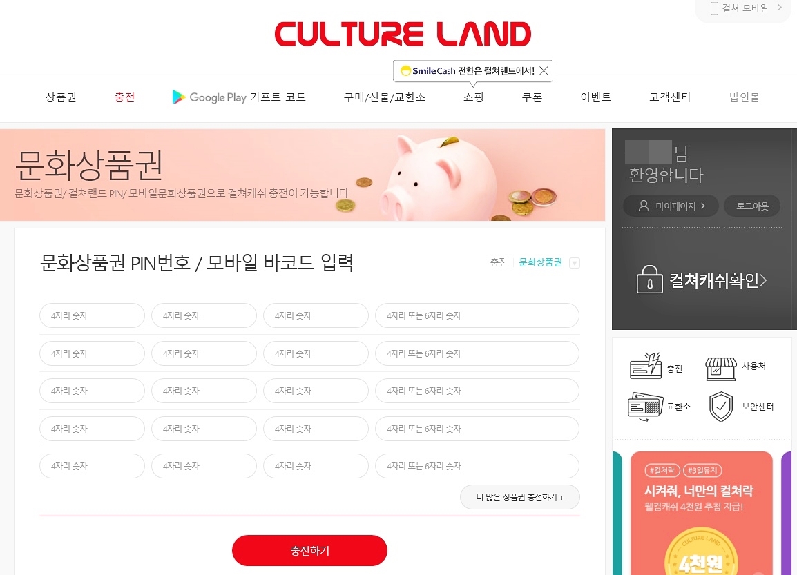 이제 이 PIN번호를 아까 처음 등록하려고 했었던 충전 -> 문화상품권 메뉴로 갑니다.