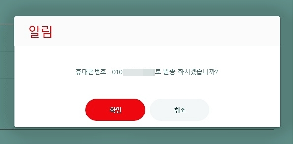 휴대폰 번호가 맞는지 확인하는 창이 뜹니다. 확인 버튼 클릭.