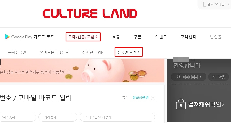 홈페이지에 접속한 다음 상단 메뉴의 구매/선물/교환소 -> 상품권 교환소 이렇게 들어갑니다.