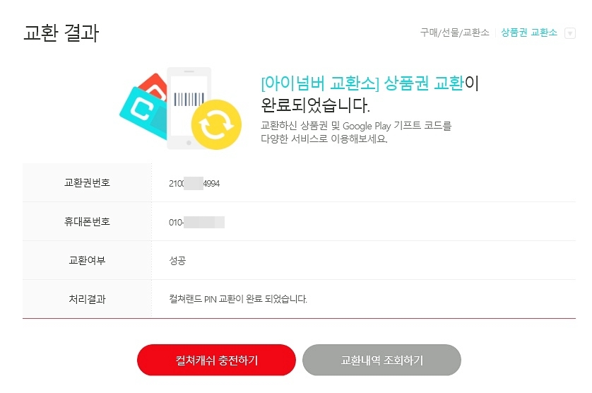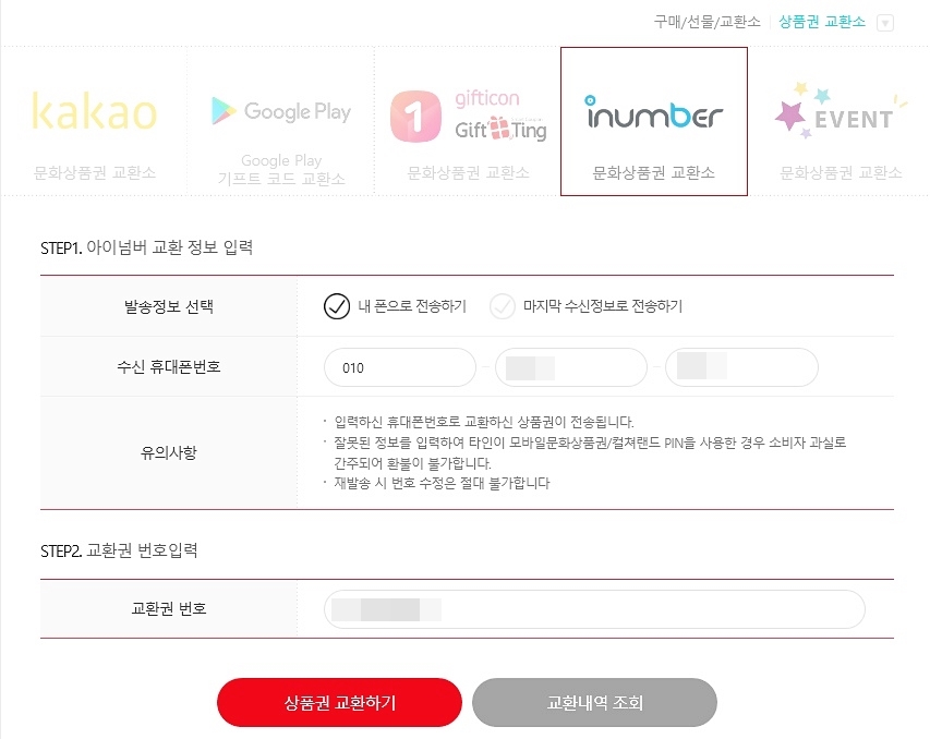 교환 과정은 이렇습니다. 먼저 수신할 휴대폰 번호를 입력하고, 교환권 번호를 입력해서 상품권으로 다시 교환하는 것입니다.