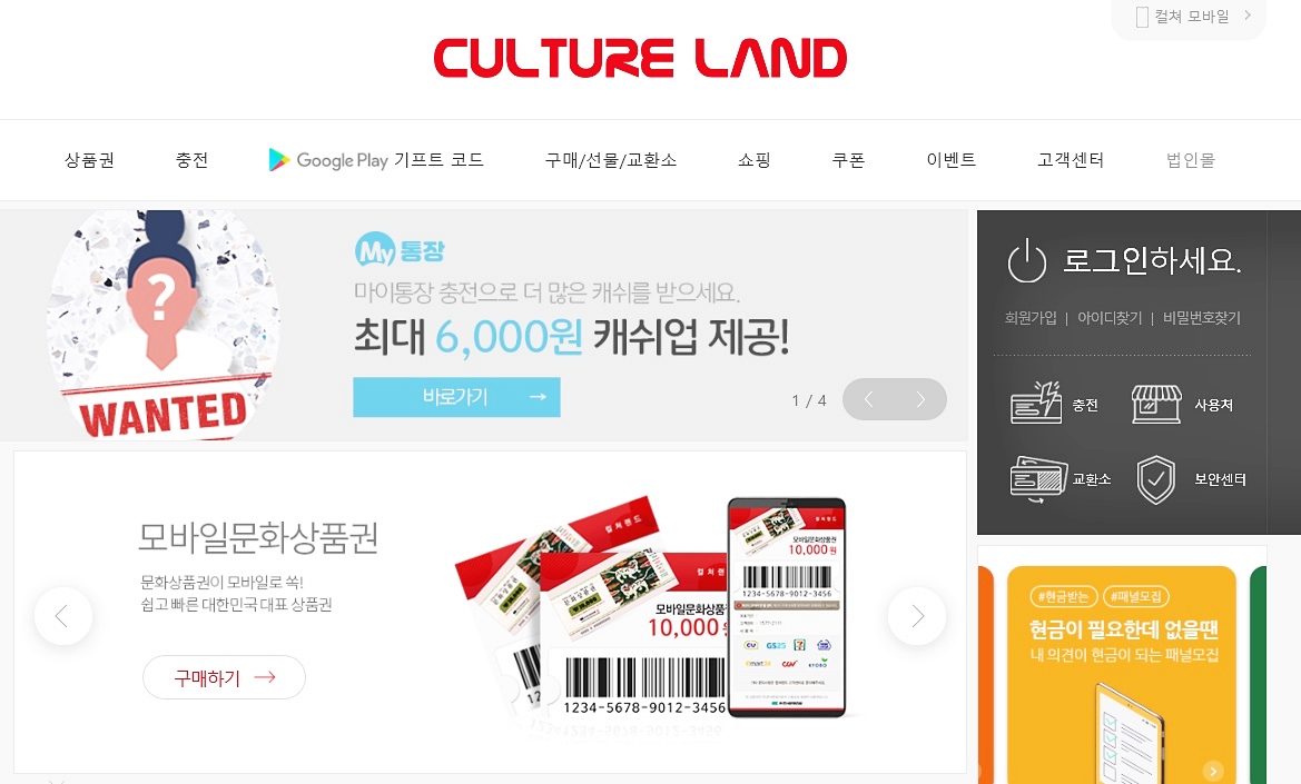 얼마 전 이벤트로 받은 문화상품권 문자입니다. 예전에도 종이로 받았을 때 충전해 봐서 문자로 받은 컬쳐랜드 문화상품권 역시 쉽게 교환할 수 있다고 생각했죠. 컬쳐랜드 홈페이지에 접속해 봤네요.
