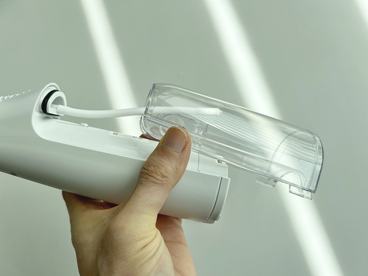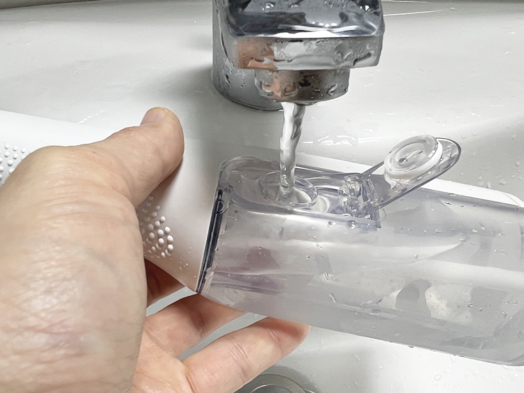두 번째 단점은 물탱크가 작습니다. 칫솔질하고 한 번 사용하려면 두 번은 물을 넣어야 제대로 쓸 수 있습니다. 이건 좀 귀찮은 면이 있는데 용량을 키우려면 부피가 커질 테니 감안을 해야겠죠.