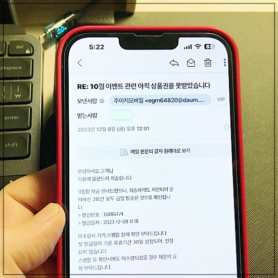 아마도 지연으로 가끔 누락되는 경우가 있으므로, 저처럼 이벤트 상품권을 받지 못한 분이라면 이렇게 메일로 문의하면 되겠습니다.