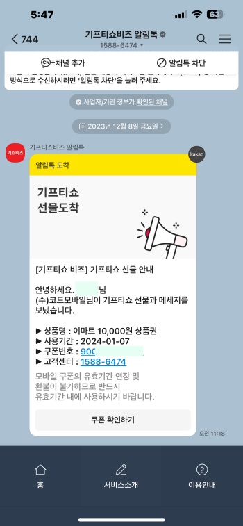 처음에 상품권은 기프티쇼 알림톡으로 와서 확인했습니다. 오전 11시 18분에 1588-6474로 왔습니다.