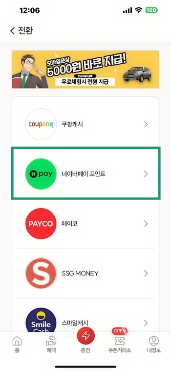 이제 충전한 컬쳐캐시를 네이버페이로 전환하는 방법입니다.