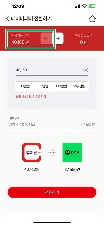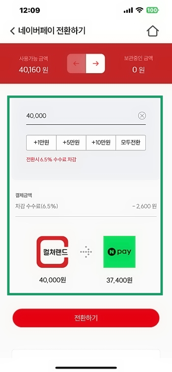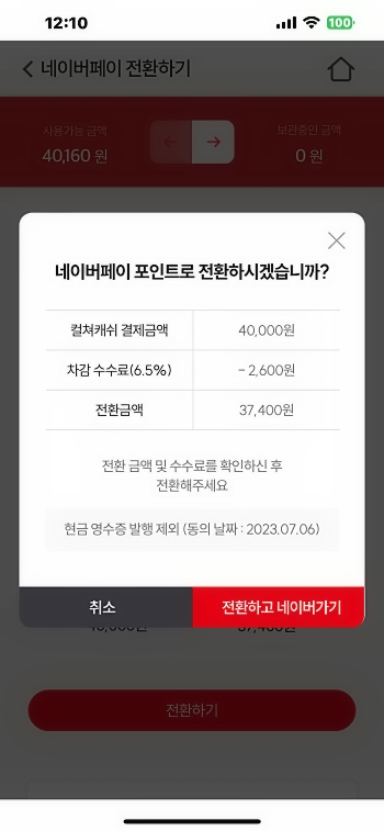컬쳐랜드 모바일 상품권을 네이버페이로 전환하는 방법입니다. 전환 수수료가 있습니다. 요즘은 대부분 이렇게 포인트 전환할 때마다 5%, 6.5%, 8% 등등의 수수료가 붙더군요.