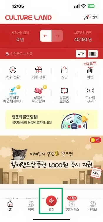 앱을 설치하고 로그인한 다음 메인 화면에서 충전 메뉴로 들어가서 컬쳐랜드 상품권을 선택합니다.