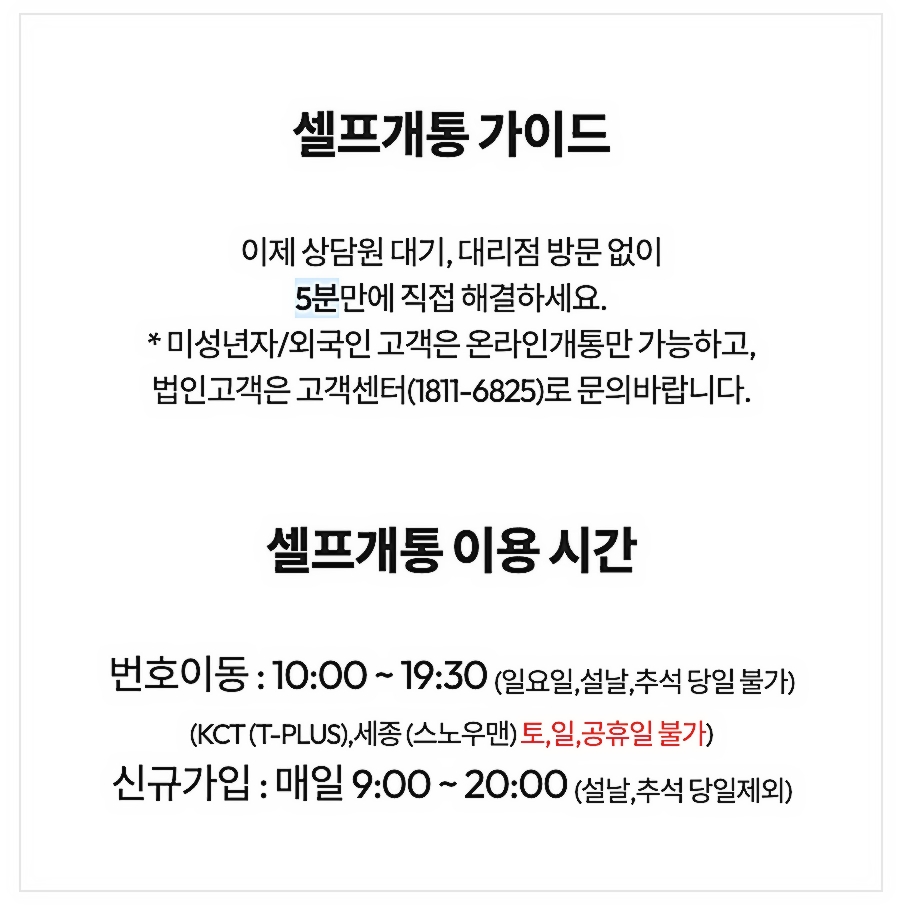 번호이동: 10:00~19:30(일요일, 설날, 추석 당일 불가)