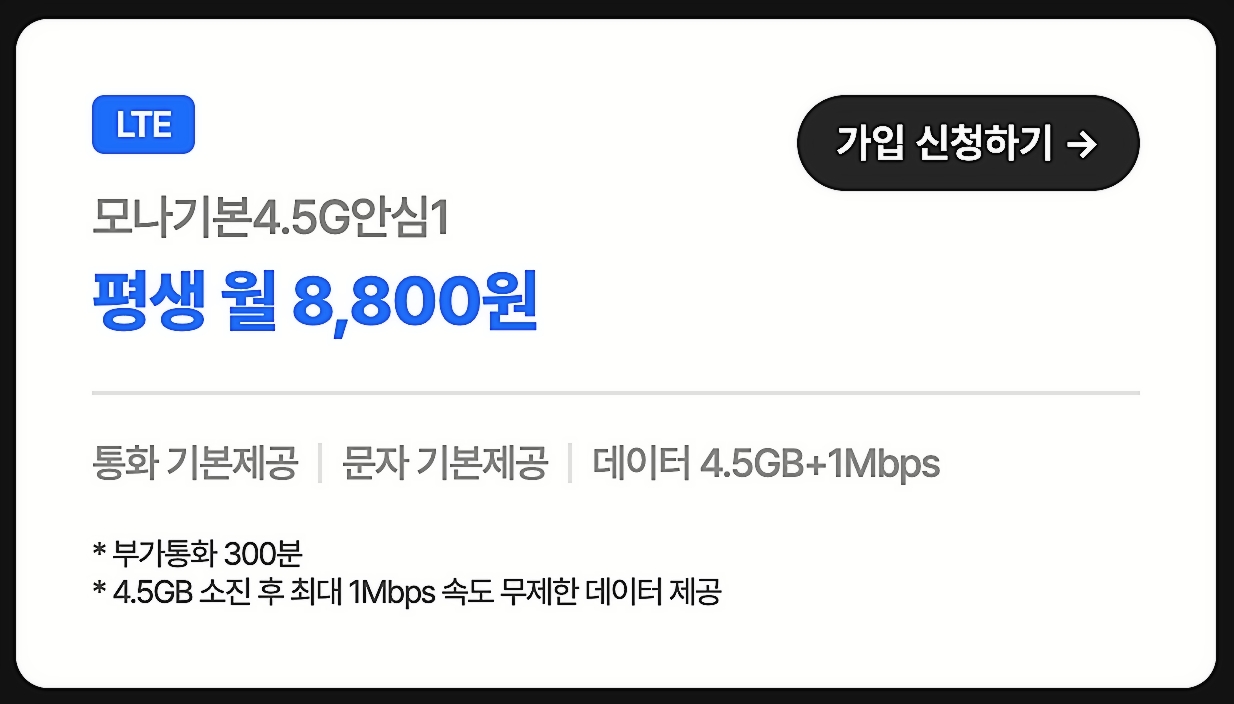 제가 가입한 요금제는 평생요금제로, 모나기본4.5G안심1 요금제입니다. 데이터는 4.5GB이지만, 다 쓰면 1Mbps로 인터넷을 할 수 있기 때문에 무제한요금제인 셈이죠.