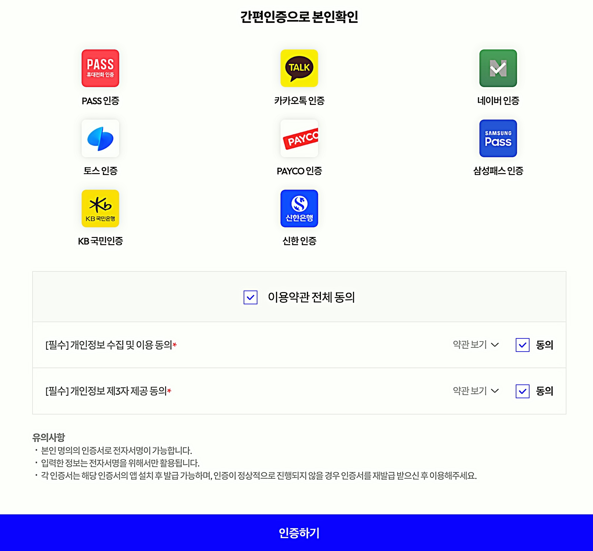 간편인증은 이 정도가 가능하네요. 네이버인증으로 진행했습니다.