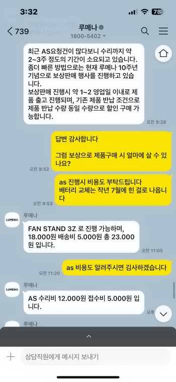상담을 하면 다음 답장이 1시간 정도 늦게 오는 편입니다. 요즘 성수기라서 AS도 많이 밀려 있다고 하네요.