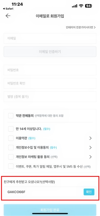 친구추천 코드는 앱에서만 사용할 수 있답니다. 일반 웹브라우저에서는 쓸 수 없으므로, 반드시 오늘의집 앱을 먼저 설치해야 합니다.