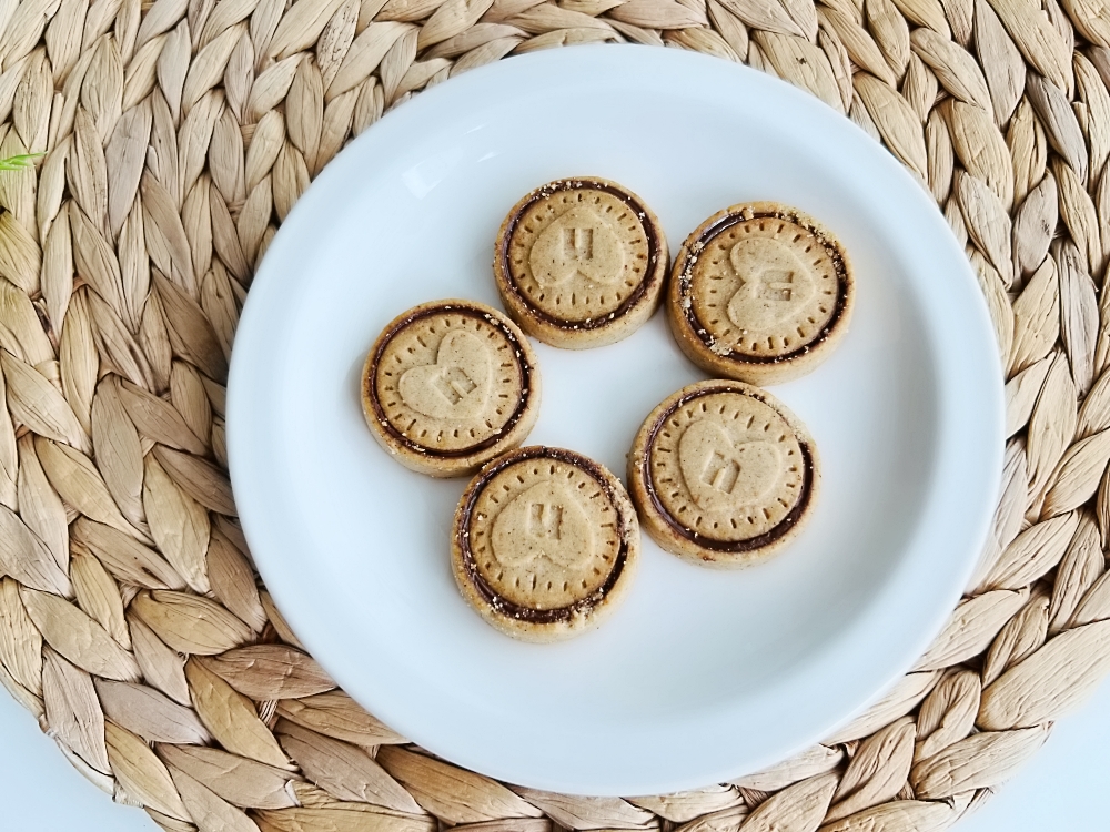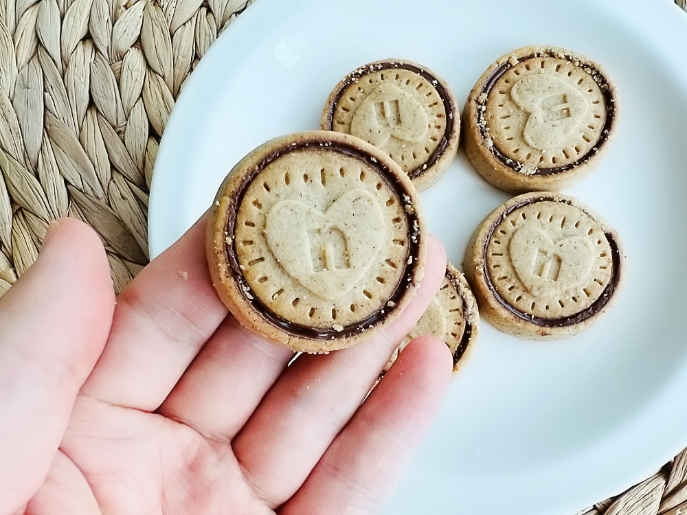 과자의 생김새를 보면 바닥에 쿠키 베이스가 있고, 그 위에 누텔라 초코잼을 얹은 다음, 그 위를 작은 쿠키 뚜껑으로 덮은 모양새입니다.