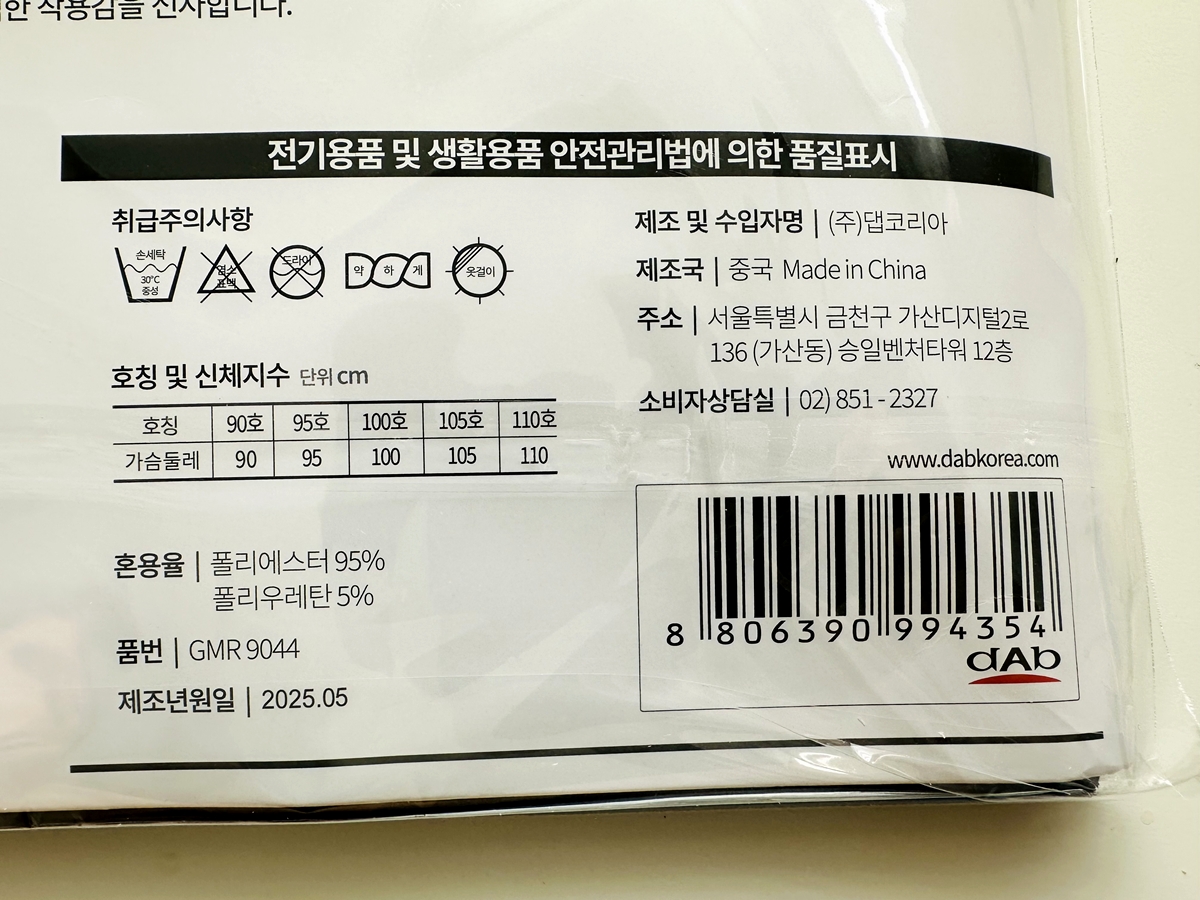 95 사이즈의 경우 가슴, 엉덩이 둘레 사이즈입니다. 여기에도 세탁 주의사항이 적혀 있습니다. 라벨이 크지 않고 작게 붙어 있어서 안쪽 꺼끌 거림이 덜하겠네요.