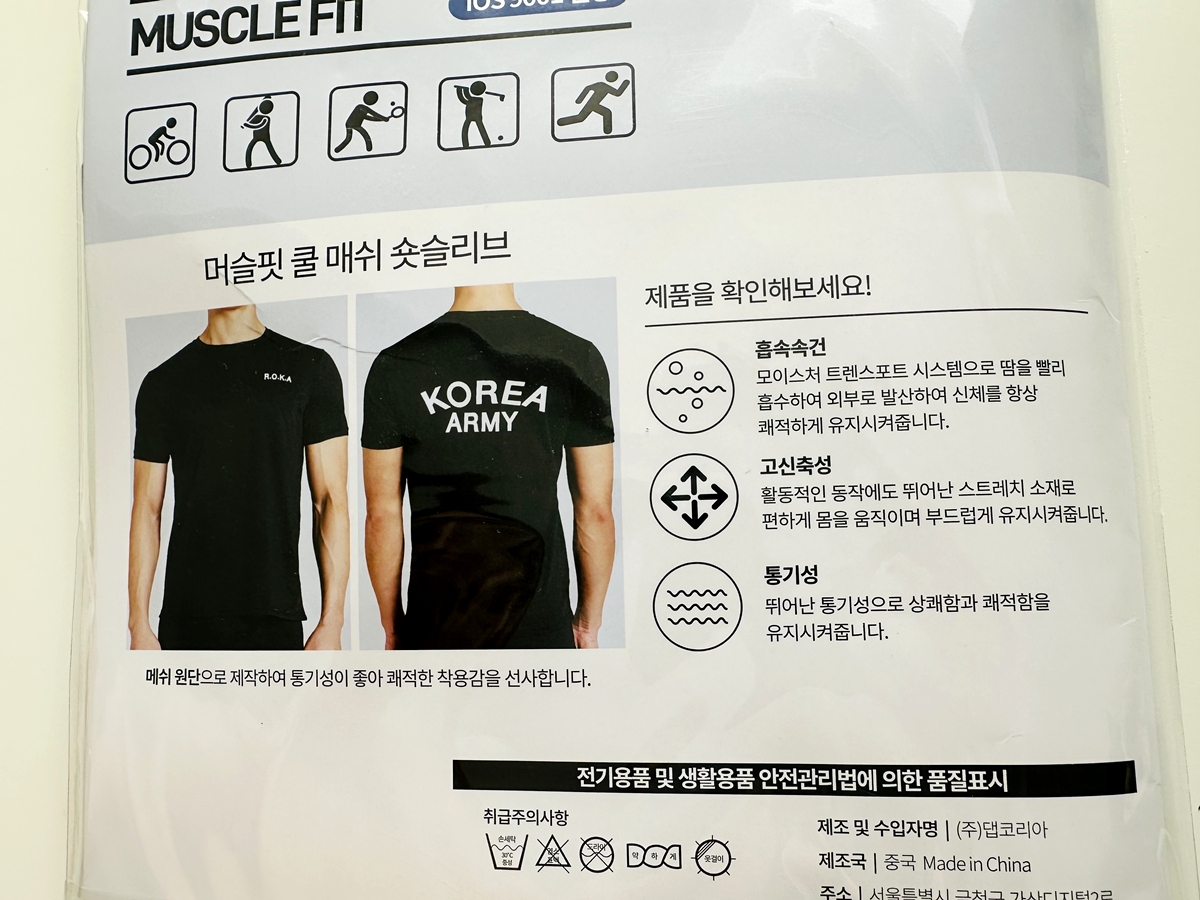 군용 제품이어서 저렴하면서도 실용적이고, 운동복이나 러닝복, 등산복, 이너웨어로 모두 다 활용이 가능합니다. 딱 한 가지 아쉬운 점이라면 어깨 태극기 와펜 패치가 없다는 점이네요. 와펜이 있는 제품도 있으니까 이건 PX에 가서 확인하면 되겠습니다.